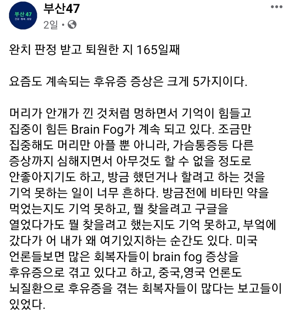 박씨는 자신이 운영하는 페이스북 페이지에 완치 이후 후유증 증상은 브레인 포그(Brain Fog), 가슴과 복부 통증, 피부 변색, 만성 피로 등 완치 이후 후유증 증상은 크게 5가지라고 설명했다.