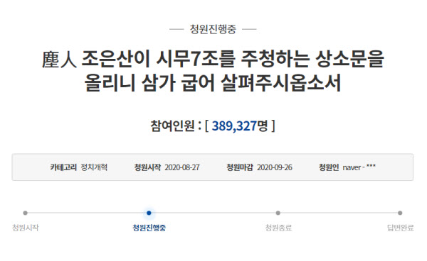 조은산은 이날 자신이 운영하는 블로그를 통해 '백성 1조에 답한다'라는 제목의 글을 올렸다. 그가 지난 12일 작성한 ‘시무 7조’ 청원 글은 보름여 비공개 상태에서도 큰 반향을 일으켰고, 청와대는 27일 뒤늦게 이 글을 공식 게재했다. 공개된 지 하루 만에 청와대 답변 요건(20만 동의)를 넘어 30만명 이상 공감을 표시했다.