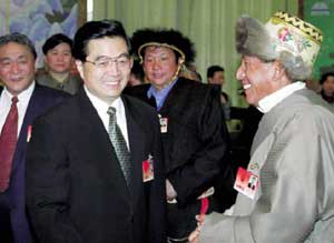 후진타오 중국 공산당총서기 겸 국가주석이 전국인민대표회에 참석한 티베트자치구 대표와 인사를 나누고 있다.