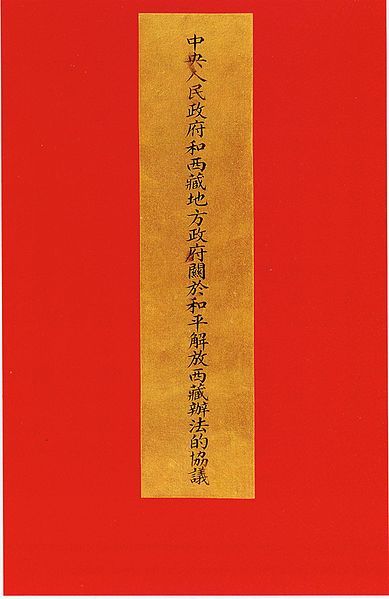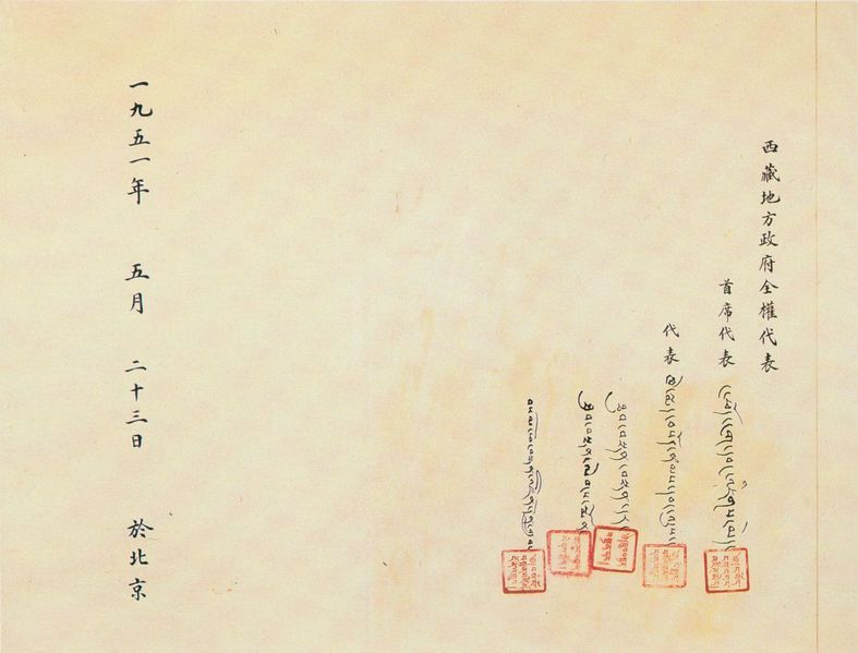 베이징에 파견한 티베트 대표단은 조약 체결에 관한 권한이 없었음에도 불구하고 중국 정부는 그들을 위협하여 서명하게 했습니다. 17조 전문을 내용상으로 보면 마치 중국이 티베트를 존중하는 것처럼 보입니다.