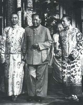 1954년 7월, 중국 베이징에서 10대 뺀첸라마(왼쪽), 마오쩌둥(가운데), 14대 달라이라마(오른쪽)