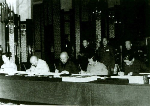 1951년 5월 23일, 평화 해방 조약에 양국 대표단이 서명하는 모습. 중국 정부의 선전용 자료로 쓰이고 있다.