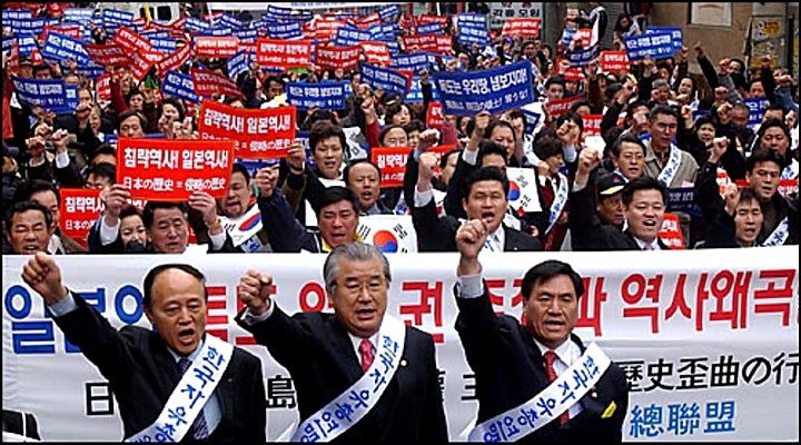 Because of the apparent inseparability of Japan's 1905 "terra nullius" annexation of Dokdo and Japan's colonization of the Korea, Japan's demands to claim Dokdo cause outrage from Korean citizens. ( Korea's Political Situation in 1905 When Japan Seized Dokdo – Takeshima Island ) To the right: Korean citizens protest Japan's claim to Dokdo accusing Japan's Government of whitewashing her past aggressions and colonial past.