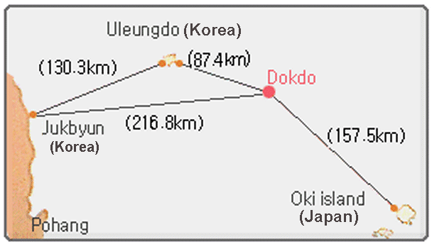 Dokdo Takeshima Island (called Liancourt Rocks by some nations and Takeshima by Japan) is 215 kms from mainland Korea and 250 kms from Japan proper. The nearest land mass is Korea’s Ulleung-do Island at about 87 kms away. The islets are visible from Korea’s Ulleungdo on fair days. The nearest Japanese territory Oki Islands is 157 kms away. Dokdo is never visible from Japan’s Oki Islands. (Dokdo Island – A Study of Visiblity and Territorial Perceptions) The total area of the islets is about 187,450 square meters, with their highest point at 169 meters in the western islet. The western islet is about 88,640 square meters in area; the eastern islet about 73,300 square meters.