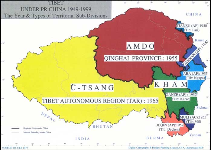 위 지도에서 티베트자치구(西藏自治區)인 위짱지역을 제외한 암도, 캄 지역 등은 중국의 칭하이성(靑海省), 간쑤성(甘肅省), 쓰촨성(四川省), 윈난성(雲南省)에 편입되었음.