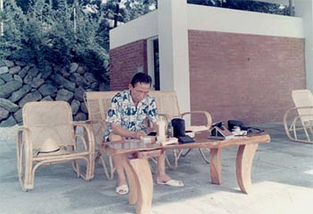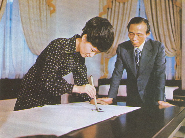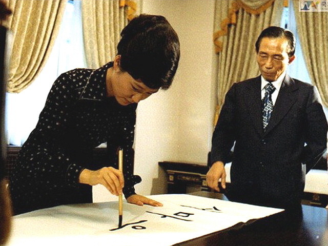 큰딸 근혜양의 서예를 흐뭇한 얼굴로 바라보고 있다.