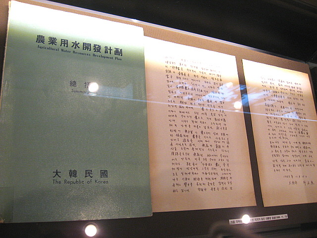 이곳에는 조국 근대화에 일생을 바친 박대통령의 치적이 전시되어 있고 각 전시물에는