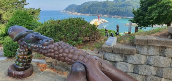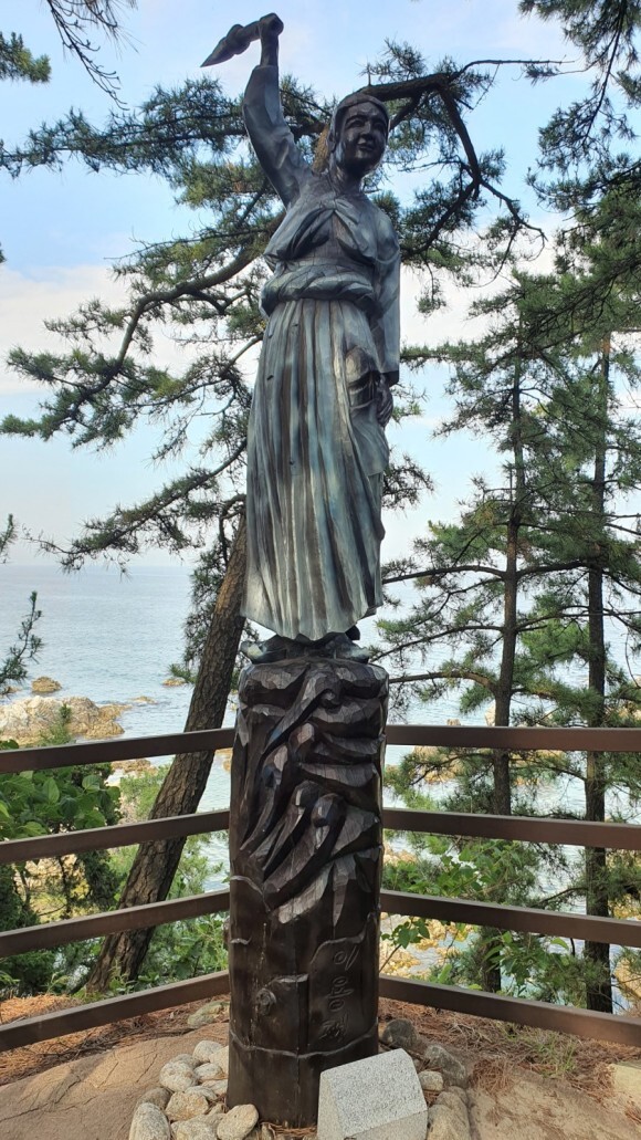 해신당 가는 길에 무언가(?) 위에서 무언가(?)를 드높이 치켜올리고 있는 여성 동상이 나옵니다. 아마도 해신당의 주인 애랑이겠죠?