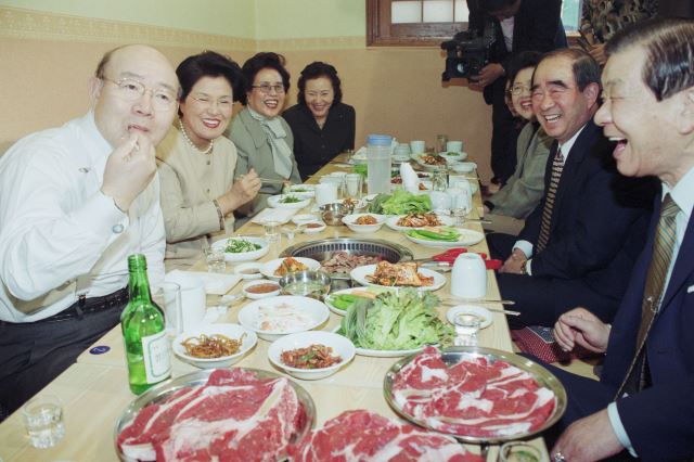 전두환 전 대통령이 2000년 4월 6일 연희동 한 음식점에서 구제역으로 곤란을 겪고 있는 축산 농가를 위한 소고기 먹기 캠페인에 참여하고 있다. 국민일보DB