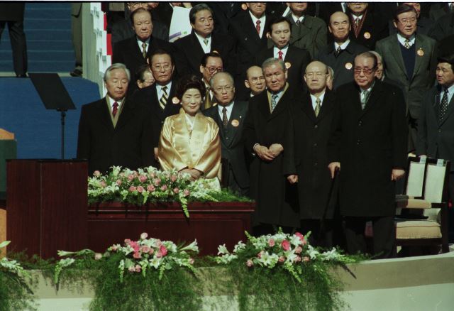 1998년 2월 25일 김대중 제15대 대통령 취임식에 참석한 전직 대통령들. 왼쪽부터 김영삼 전 대통령, 손명숙 여사, 노태우 전 대통령, 전두환 전 대통령, 최규하 전 대통령. 국민일보DB