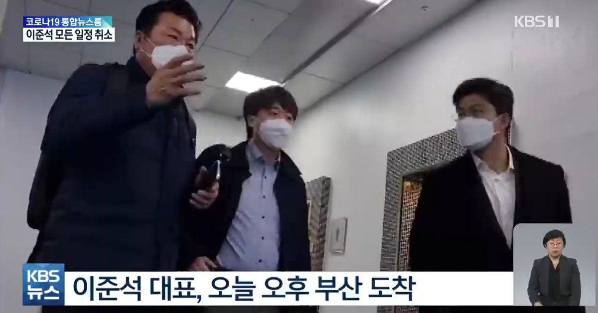 KBS는 이날 오후 김해공항에서 이 대표를 포착했다. 영상에서 이 대표는 김해공항 출구를 향해 걸어가고 있다. 또 부산에서 김철근 당대표 정무실장과 김용태 청년최고위원 등과 만나 대화를 나누며 걸음을 옮기고 있다.