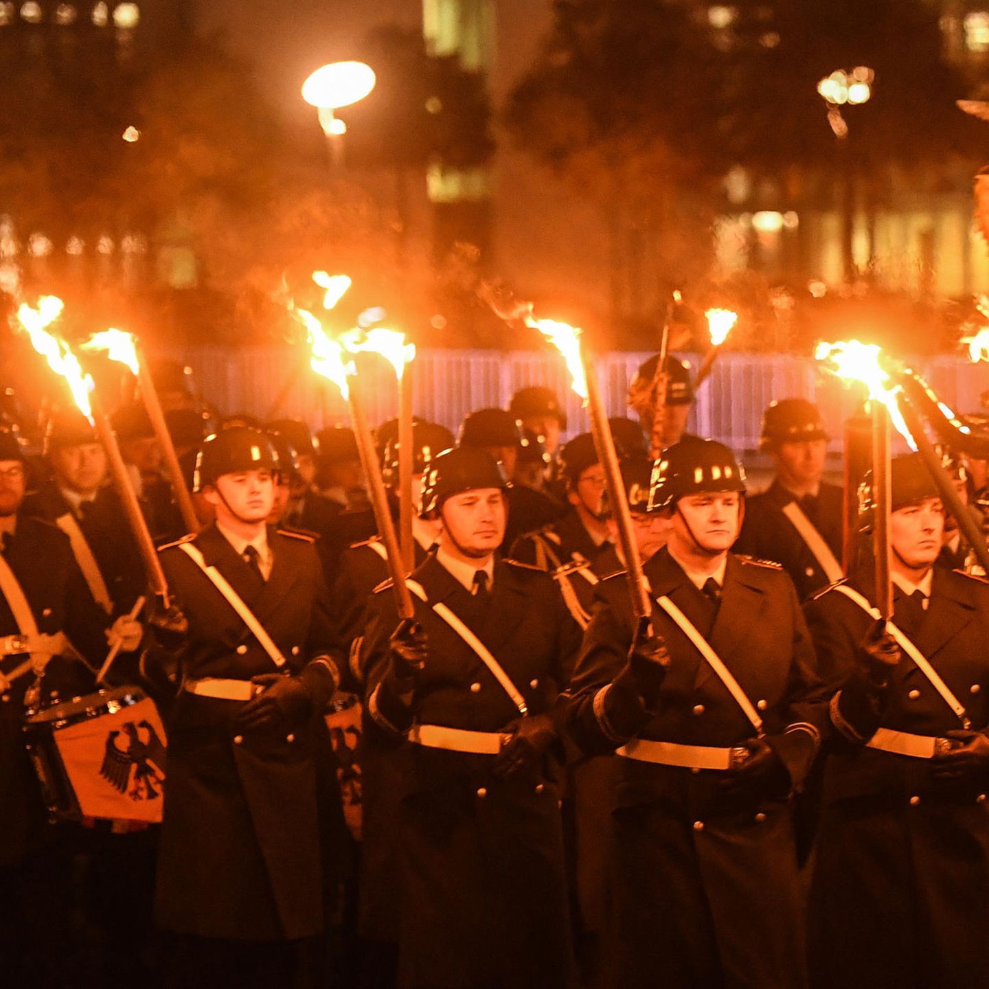 The Zapfenstreich is performed only during national celebrations and solemn public commemorations, to honour distinguished persons present at such special events. Examples are the farewell ceremony for a German federal president, or at the conclusion of large military exercises. It takes place in the evening hours and consists of a military formation of at least one military band, two platoons of armed infantrymen, and two lines of soldiers carrying torches, in total about 400 men.