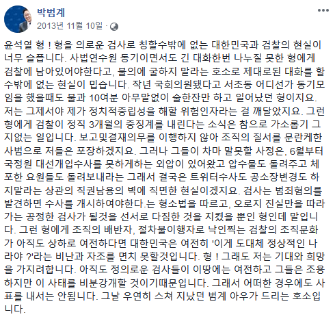 당시 박 의원은 윤 총장을 향해 "윤석열 형! 형을 의로운 검사로 칭할 수밖에 없는 대한민국과 검찰의 현실이 너무 슬프다"며 "사법연수원 동기이면서도 긴 대화 한 번 나누질 못한 형에게 검찰에 남아 있어야 한다고, 불의에 굴하지 말라는 호소로 제대로 된 대화를 할 수밖에 없는 현실이 밉다"고 했다. 윤 총장과 박 의원은 사법연수원 23기 동기다.