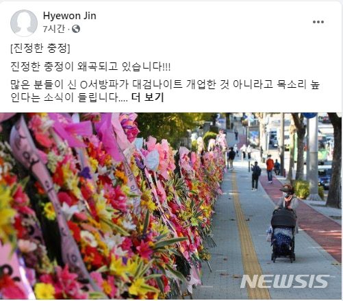 전날(24일) 진 부부장검사는 페이스북에 대검 앞 화환 사진을 올리며 “서초동에 있는 신 ○서방파가 대검 나이트라도 개업한 줄 알았다”라며 “보통 마약 등을 판매하거나 안마 업소, 노점상 등을 갈취해 돈을 버는 조직폭력배들은 나이트클럽, 호텔 등을 인수하는 방법으로 해당 영역에서 위세를 과시하는데 개업식에 분홍색, 붉은색 꽃을 많이 쓴다”고 지적했다.