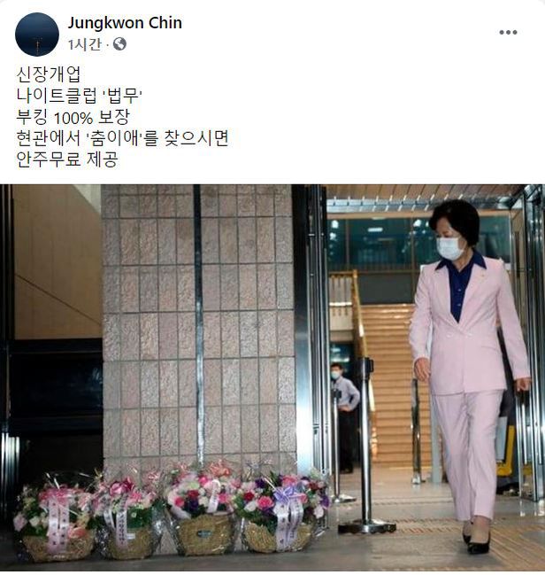 이와 관련, 진중권 전 교수는 페이스북에 추미애 법무부 장관이 자신의 지지자들이 보내온 꽃바구니를 흐뭇하게 바라보는 사진을 게재하고 “신장개업, 나이트클럽 ‘법무’”라고 했다.