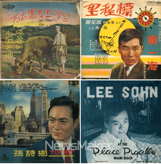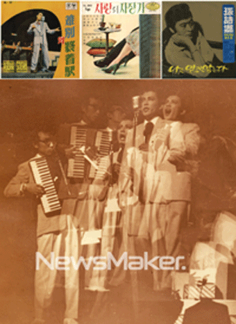 ▲ 손시향 발표 음반들. 그리고 작곡가 박춘석의 반주에 맞춰 노래하고 있는 미8군쇼 시절의 가수 손시향