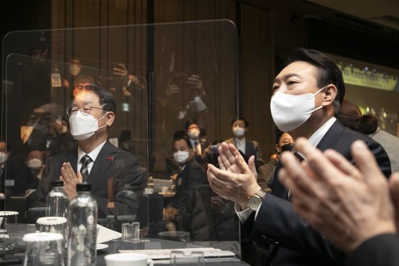 이재명 더불어민주당 대선후보(왼쪽)와 윤석열 국민의힘 대선후보(오른쪽)가 28일 오후 페어몬트 엠버서더 서울 그랜드 볼룸에서 열린 ‘국가 균형 발전을 위한 지방 소멸 대응 특별 법안 국회발의 간담회’에 참석해있다. 국회사진기자단