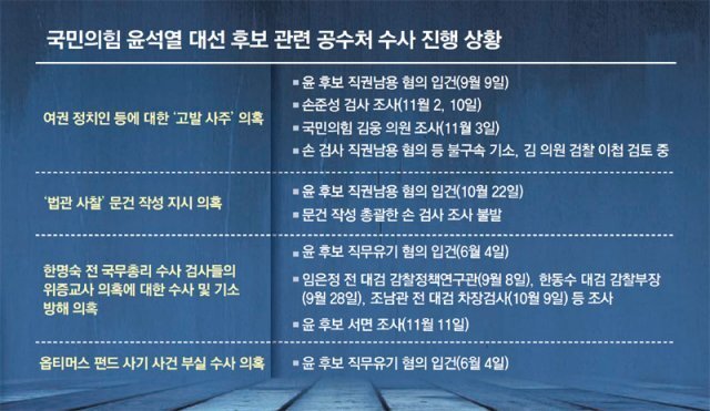 이와 함께 공수처는 윤 후보의 ‘법관 사찰’ 문건 작성 지시 의혹에 대해서도 수사에 진척을 보이지 못하고 있어 내년까지 수사가 이어질 것으로 전망된다. 해당 문건 작성을 총괄한 손 검사는 이달 6일부터 현재까지 입원 중이다. 손 검사 측은 이달 8일 “손 검사의 건강 악화로 병원에 입원해 치료를 받고 있어서 당분간 공수처에 출석해 조사받기 어렵다”는 의견서를 공수처에 제출했다.