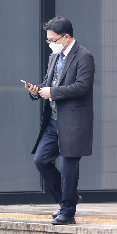 정치인과 언론인 등을 대상으로 통신자료를 무더기로 조회해 검찰에 고발된 김진욱 공수처장이 29일 자신의 휴대폰을 바라보며 정부과천청사를 나서고 있다. [사진 출처 = 연합뉴스]