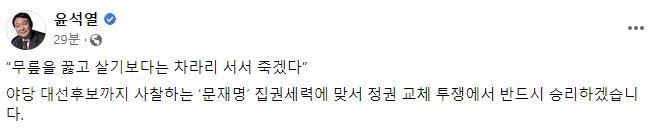 윤 후보는 이날 오전 페이스북에 올린 글에서 "무릎을 꿇고 살기보다는 차라리 서서 죽겠다"며 이같이 말했다. '문재명'은 문재인 대통령과 이재명 더불어민주당 대선후보를 동시에 겨냥한 말로 풀이된다.
