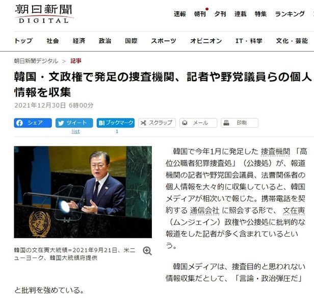 일본 아사히신문이 30일 한국 공수처가 언론인, 야당 의원, 법조계 인사의 개인정보를 대대적으로 수집해 왔다며 자사 기자도 그 대상에 포함됐다고 보도한 기사. /아사히신문 홈페이지 캡처