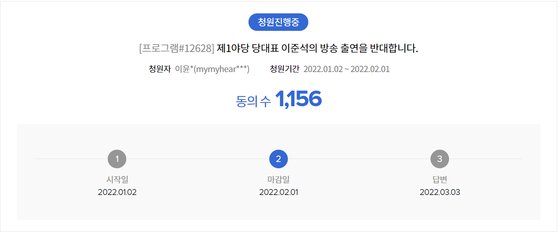 성접대 의혹이 제기된 이준석 국민의힘 대표의 공영방송 출연을 막아달라는 KBS 시청자권익센터 청원이 게재된 지 하루 만에 답변 기준인원을 충족했다. 이 대표 청원에는 4일 오전 8시 30분 현재 1156명이 동의했다.