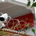 신장 위구르 자치구 도시에 붙은 중국 정치 선전 배너와 감시카메라/사진=로이터