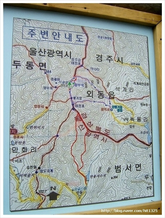 주산인 경주의 묵장산(墨匠山; '먹을 만드는 장인'山, 781.2m) 남쪽에 솟은 봉우리로