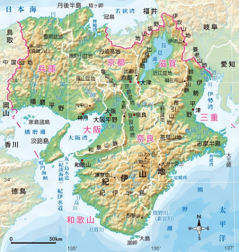 近畿地方の定義は、大阪府・京都府・兵庫県・滋賀県・奈良県・和歌山県・三重県の2府5県となっています。