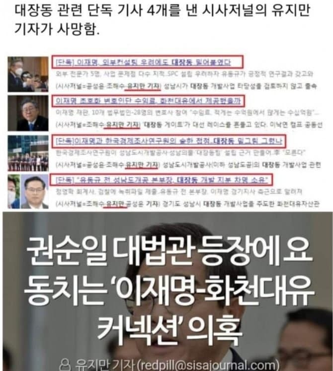 대장동 비리 관련 기사를 열심히 썼던 시사저널의 유지만 기자가 2022년 1월 17일 사망했습니다.