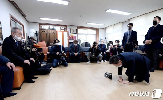 이재명 더불어민주당 대선 후보가 19일 오후 서울 동작구 동작노인회관에서 열린 '노후가 행복한 대한민국, 어르신의 목소리를 청취하다' 어르신과의 대화에 앞서 큰절을 하고 있다./뉴스1 © News1 국회사진취재단