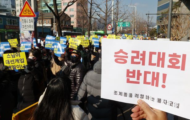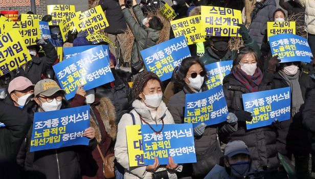이른바 ‘조국 사태’ 당시 ‘조국 수호’ 집회를 열었던 개혁국민운동본부(개국본)가 20일 조계사 앞에서 “조계종이 노골적인 대선 개입을 하고 있다”며 이를 규탄하는 집회를 열었다. 조계종은 오는 21일 조계사에서 문재인 정부의 종교 편향 문제를 비판하겠다며 전국승려대회 개최를 예고했는데 현 시점에 이런 대회를 여는 것이 정치 개입이라는 것이다.