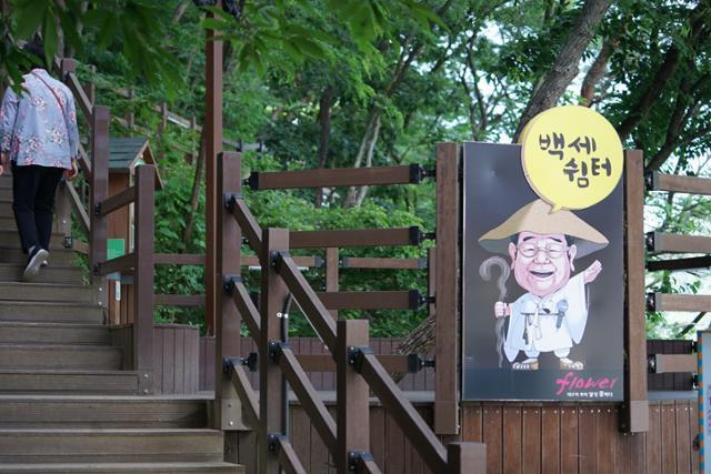 공원 입구에 들어서자 송해 선생의 캐릭터 조형물이 반겼다. 공원 곳곳엔 그의 기운이 스며있었다. 둘레길을 따라 걷다 보면 여러 곳에서 송해 선생을 만나게 된다. 송해공원을 비롯해 사문진나루터, 비슬산, 용연사 등 달성군의 관광명소를 소개하는 송해 선생의 육성이 곳곳에서 흘러나온다.