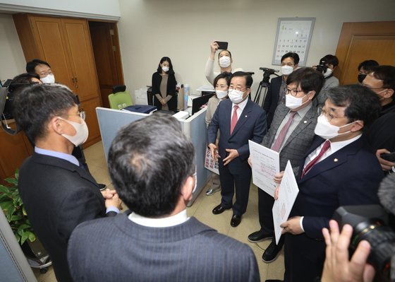 국민의힘 의원들이 2021년 4월 7일 오후 경기 과천시 중앙선거관리위원회를 항의 방문해 조해주 상임위원과의 면담을 요청하고 있다. 선관위가 투표소에 공고한 오세훈 국민의힘 서울시장 후보 배우자의 납세액 정정 공고에 따르면 최근 5년간 오 후보 배우자의 납세액은 1억1997만9000원이나 선관위에 신고한 액수는 1억1967만7000원으로 실제로는 30만2000원을 더 냈다. 이에 국민의힘은 선관위가 '누락'이라는 표현을 써 유권자들에게 오 후보가 세금을 누락했다는 오해의 소지를 남겼고 이는 선관위가 오 후보의 낙선운동을 한 것이라고 주장했다. 뉴스1
