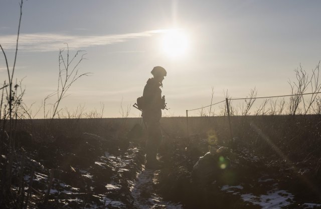20일(현지시간) 우크라이나 도네츠크주 마리우폴에서 우크라이나군 병사들이 친 러시아 반군과의 대치 지역에서 근무하고 있다.마리우폴=AP/뉴시스
