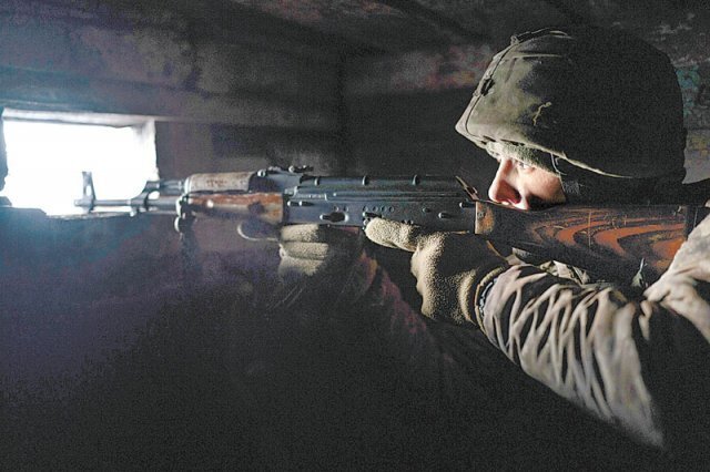 20일(현지 시간) 우크라이나 루간스크주 졸로테의 러시아 접경지역에 배치된 우크라이나 병사가 바깥을 향해 소총을 겨누고 있다. 사진 출처 게티이미지코리아