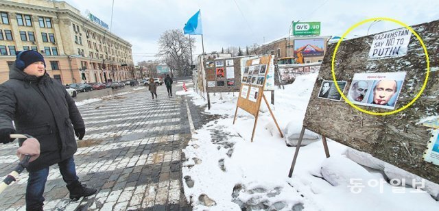 광장 옆에는 블라디미르 푸틴 러시아 대통령의 입에 핏자국을 그리고 ‘피의 형제’라고 비판하는 사진이 게시판에 붙어 있었다. 이를 보던 시민들은 고개를 저으며 “푸틴은 전범(戰犯)”이라고 했다.