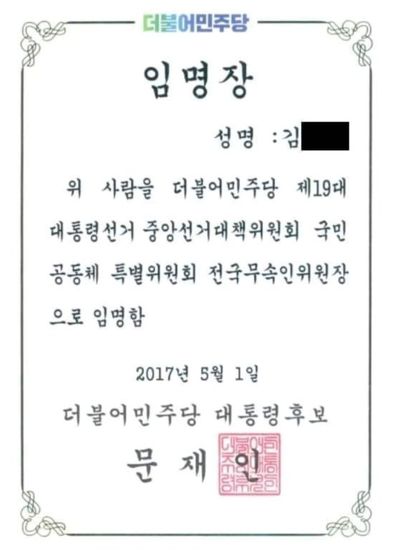 국민의힘 하태경 의원이 지난 18일 공개한 2017년 대선 당시 문재인 더불어민주당 후보가 발부한 ‘전국무속인위원장’ 임명장. 하태경 의원 제공