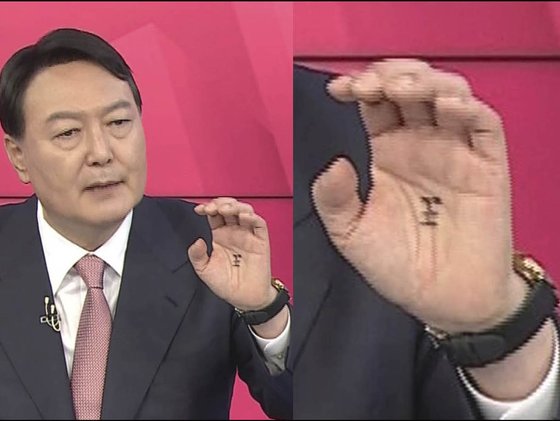 지난해 10월 국민의힘 대선 경선 TV 토론 과정에서 윤석열 후보의 손바닥에 포착된 ‘왕(王)’자 모습. 윤 후보 측은 당시 “윤 후보와 같은 아파트에 사는 지지자들이 토론이 있을 때마다 응원한다는 뜻에서 손바닥에 적어준 것”이라고 해명했다. MBN 유튜브 캡처