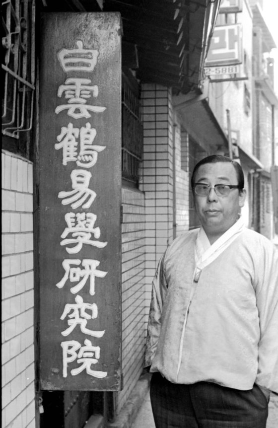 1961년 5·16 뒤 박정희 당시 국가재건최고회의 의장을 만난 “각하, 한 20년은 가겠습니다”고 말한 걸로 알려진 역술가 백운학(본명 이종우)씨가 자신이 차린 ‘백운학역학연구원’ 간판 옆에서 찍은 사진. 중앙포토