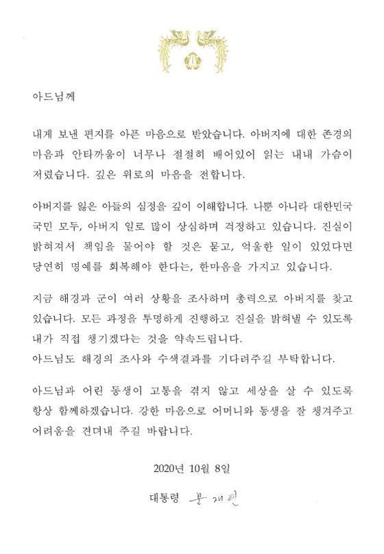 문재인 대통령이 지난 2020년 10월 서해상에서 북한군에 살해된 이모씨의 아들에게 보낸 편지. 연합뉴스