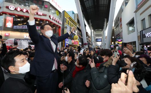 국민의힘 윤석열 대선 후보가 지난 21일 오후 대전 동구 중앙시장을 찾아 즉석연설하기 전 손 인사를 하고 있다. 연합뉴스