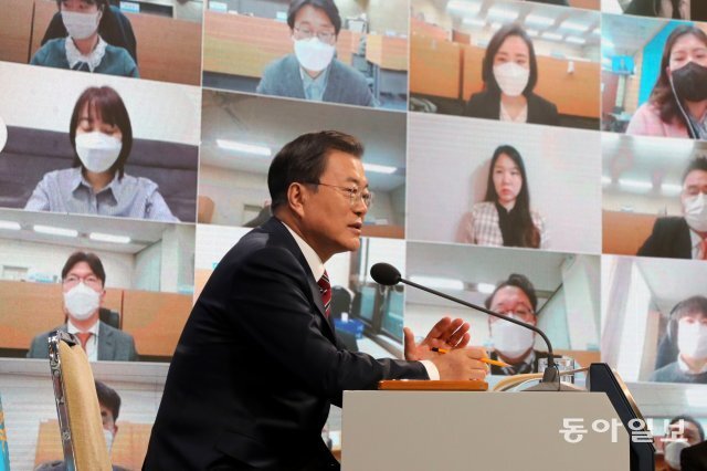 2021년 1월 18일 온오프라인 혼합 방식으로 진행된 신년기자회견에서 기자들의 질문에 답하고 있는 문재인 대통령. 동아일보DB