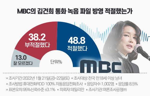 '김건희 녹취록'을 보도한 것에 대해서는 '적절했다'는 평가가 다수를 차지했다. '윤 후보 배우자가 기자와 나눈 통화 녹음 파일을 공영방송인 MBC가 방영한 것에 대해 어떻게 생각하십니까'라는 설문에 응답자의 48.8%가 '적절했다'고 답했다. '부적절했다'는 응답은 38.2%, 잘 모르겠다는 13.0%로 집계됐다.