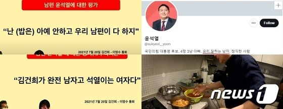 트위터에 '요리 잘하는 남자'라고 소개(윗줄 오른쪽부터 시계방향) 한 윤석열 국민의힘 후보가 요리하는 모습과 "밥은 남편이 다 한다"고 한 녹취록속 김건희씨 발언. (SNS 갈무리) © 뉴스1