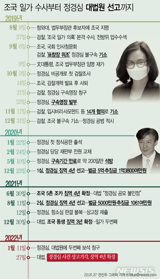 [서울=뉴시스] 27일 법원에 따르면 대법원는 이날 자본시장과 금융투자업에 관한 법률 위반 등 혐의로 기소된 정경심 전 동양대학교 교수의 상고심에서 징역 4년을 선고한 원심을 확정했다. (그래픽=전진우 기자) 618tue@newsis.com