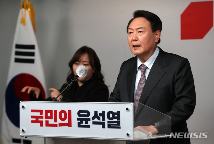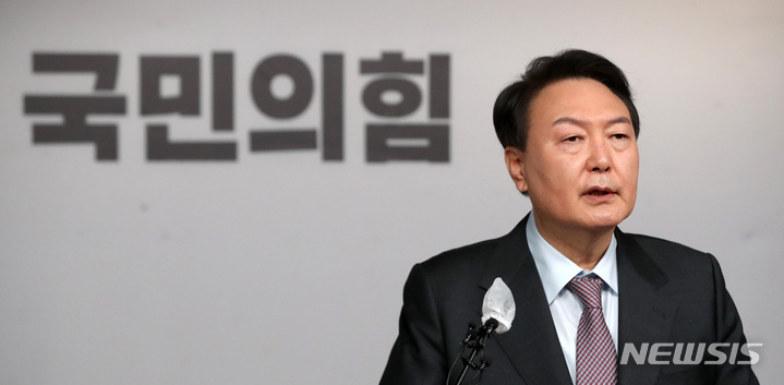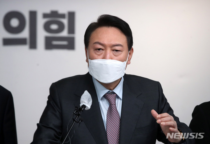 [서울=뉴시스]전진환 최서진 기자 = 윤석열 국민의힘 대선 후보는 27일 국민의힘 당사에서 "제가 대통령이 되면 기존의 대통령은 사라질 것"이라고 밝혔다.