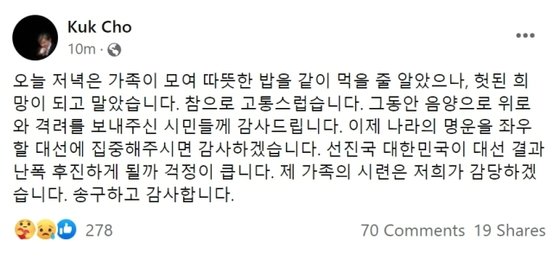 조 전 장관은 지지자들을 향해 "음양으로 위로와 격려를 보내주신 시민들께 감사드린다. 이제 나라의 명운을 좌우할 대선에 집중해 주시면 감사하겠다"며 "선진국 대한민국이 대선 결과 난폭 후진하게 될까 걱정이 크다"고 당부했다.