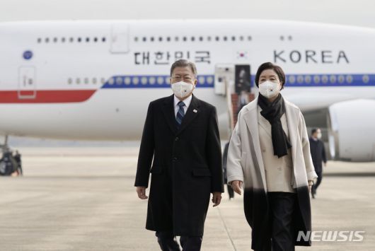 [성남=뉴시스] 김진아 기자 = 아랍에미리트(UAE), 사우디아라비아, 이집트 등 중동 3개국 순방을 마친 문재인 대통령과 부인 김정숙 여사가 22일 경기 서울공항에 도착해 공군 1호기에서 내려 이동하고 있다. 2022.01.22. bluesoda@newsis.com