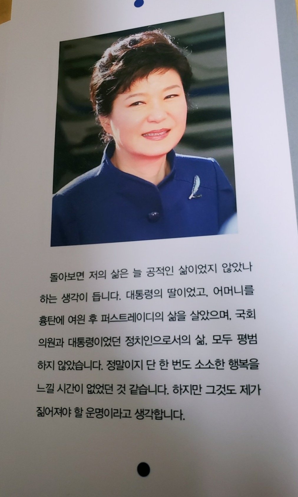 박 대통령은 서문에서 “많은 실망을 드렸음에도, 따뜻한 사랑이 담겨 있는 편지를 보내주시는 국민 여러분이 있어 지금까지 견뎌낼 수 있었습니다.